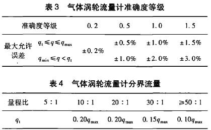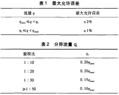 在GB21391--2008《用天然氣渦輪流量計測量天然氣流量》對分界流量q,有明確的定義,即低于該流量要采用擴展誤差限的流量值。標(biāo)準(zhǔn)*5.2條從*大允許誤差和量程比兩方面對分界流量做出了規(guī)定,且明確了量程比是在*大允許誤差范圍內(nèi)流量計的*小流量和*大流量之比。該標(biāo)準(zhǔn)中對渦輪流量計要求的*大允許誤差如表1所示,量程比與分界流量q,的關(guān)系如表2所示。
