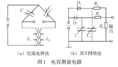 差壓液位變送器的測量電路如圖1所示,變送器的輸出可以轉換成電壓、電流或頻率等信號,然后放大。圖1(a)的交流電橋法是將兩個電容器接于交流電橋的兩個相鄰臂上,交流電橋的輸出經(jīng)放大與相敏檢波后進行測量。圖1(b)的雙T網(wǎng)絡法壓差引起的電容變化轉換成電壓變化輸出。在交流電源正半周時,通過二極管D1對電流器C1進行充電,在負半周時,電容器C1經(jīng)電阻R1與R3進行對地放電;而電容器C2 則在電源的負半周充電、正半周對R3 與R2 反向放電。因此R3上兩端的電壓輸出是由C1與C2的平均放電電流之差所決定的。當壓差為零時,C1、D1、R1與C2、D2、R2的參數(shù)相同,則通過R3的平均放電電流之差為零。當壓差不等于零時,差動電容C1與C2一個增大一個減小,使兩者的平均放電電流不相等,因此R3兩端的電壓輸出也就有了相應的變化。